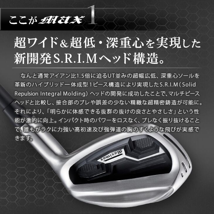なんと通常アイアン比1.5倍に迫るUT並みの超幅広低、深重心ソールを革新のハイブリッド一体成型1ピース構造により実現したS.R.I.M(Solid Repulsion Integral Molding)ヘッドの開発に成功したことで、マルチピースヘッドと比較し、接合部のブレや誤差の少ない精緻な超精密鋳造が可能に。